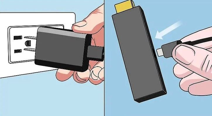 # 1: Connect your Fire Stick to a power source. The smaller end of the adapter (Micro USB) goes into the Fire Stick, and the other end (regular USB) goes into the power adapter.